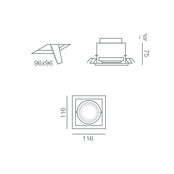 Το Standard Easy 1φ είναι χωνευτό φωτιστικό οροφής, κατασκευασμένο από αλουμίνιο και χάλυβα, βαμμένο ηλεκτροστατικά ασημί – νίκελ ματ χρώματος. Δύο κινήσεων, με κάθετη περιστροφή 45° και οριζόντια 45°. Διαστάσεις: 116 x 116 mm H: 75 mm. Κοπή οπής: 96 x 96 mm.