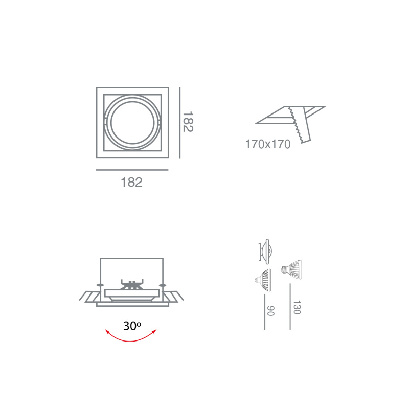 Διαστάσεις 182 x 182 mm  H: 90 mm. Κοπή οπής: 170 x 170 mm