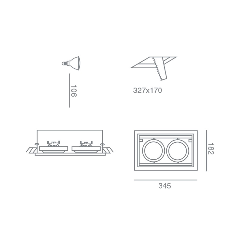 Διαστάσεις 182 x 345 mm  H: 106 mm Κοπή οπής: 170 x 327 mm