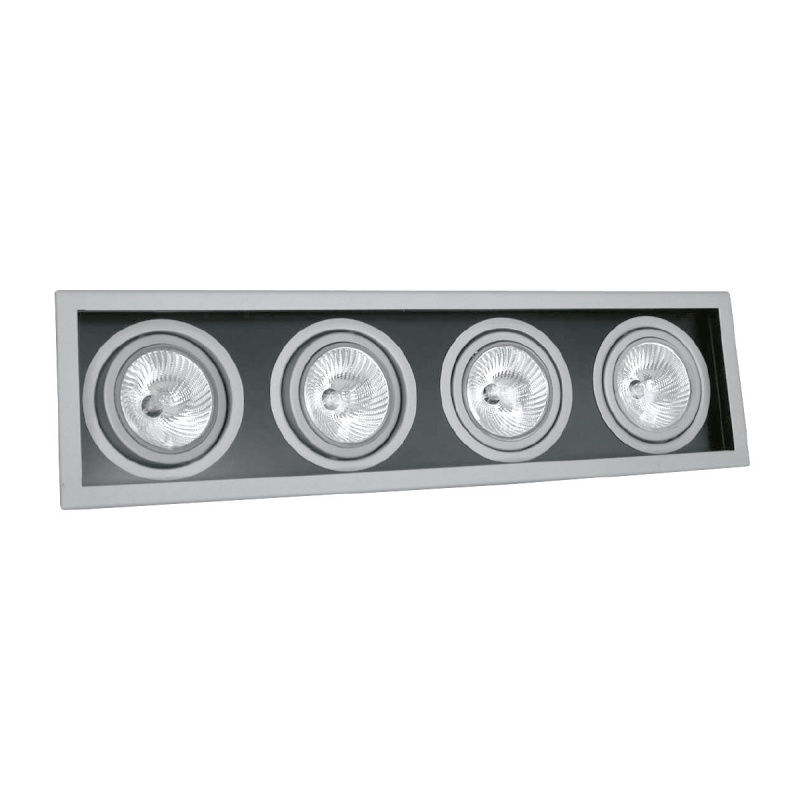 Το Dark D4114 E27 είναι ένα χωνευτό φωτιστικό οροφής, κατασκευασμένο από αλουμίνιο και χάλυβα, βαμμένo ηλεκτροστατικά λευκού – ασημί – μαύρου χρώματος. Με την φωτιστική πηγή τοποθετημένη βαθειά στο σώμα των φωτιστικών για αντιθαμβωτικό αποτέλεσμα, κατάλληλο για Darklight φωτισμό. Μίας κίνησης, με κάθετη περιστροφή 30°. Κατάλληλο για λαμπτήρες E27  LED PAR30 LAMPS, HALOGEN PAR30 LAMPS. Διαστάσεις: 667 x 182 mm  H: 120 mm, Κοπή οπής: 650 x 170 mm. Ιδανικό για επαγγελματικούς χώρους και οικίες.