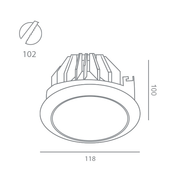 Διαστάσεις: Ø 118 mm. H: 100 mm. Κοπή οπής: Ø 102 mm.