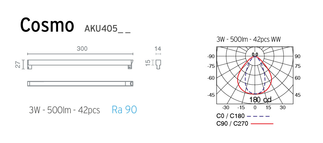 Κατασκευάζονται σε τέσσερα μεγέθη. Cosmo 1 300 χ 14 mm 3W 500Lm με απόδοση 167Lm /W. Cosmo 2 600 x 14 mm 6W 1000Lm με απόδοση 167Lm /W.