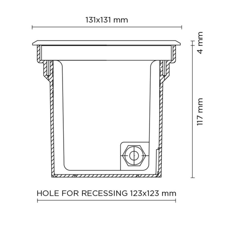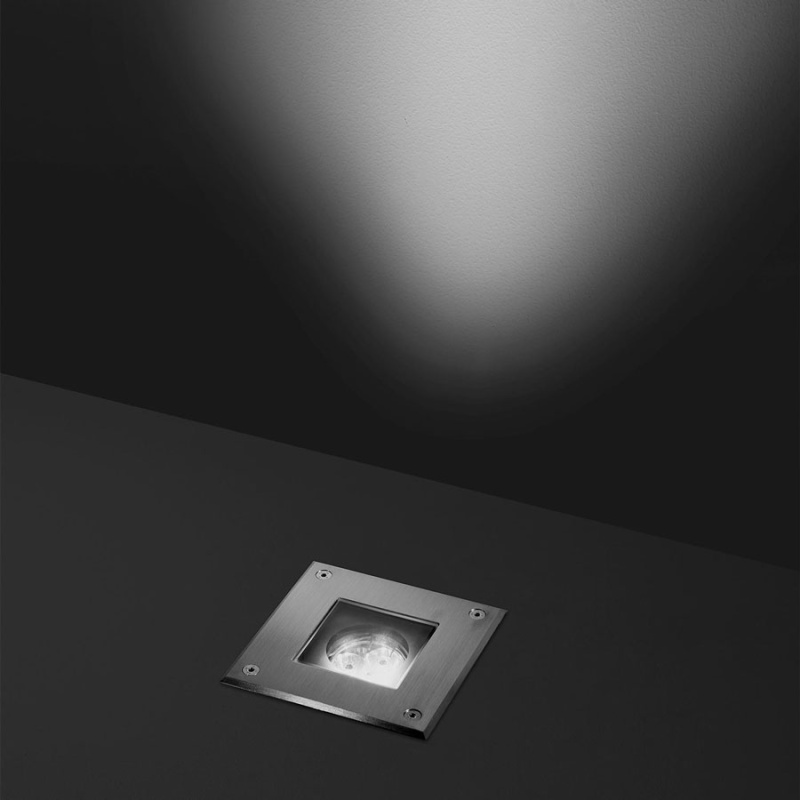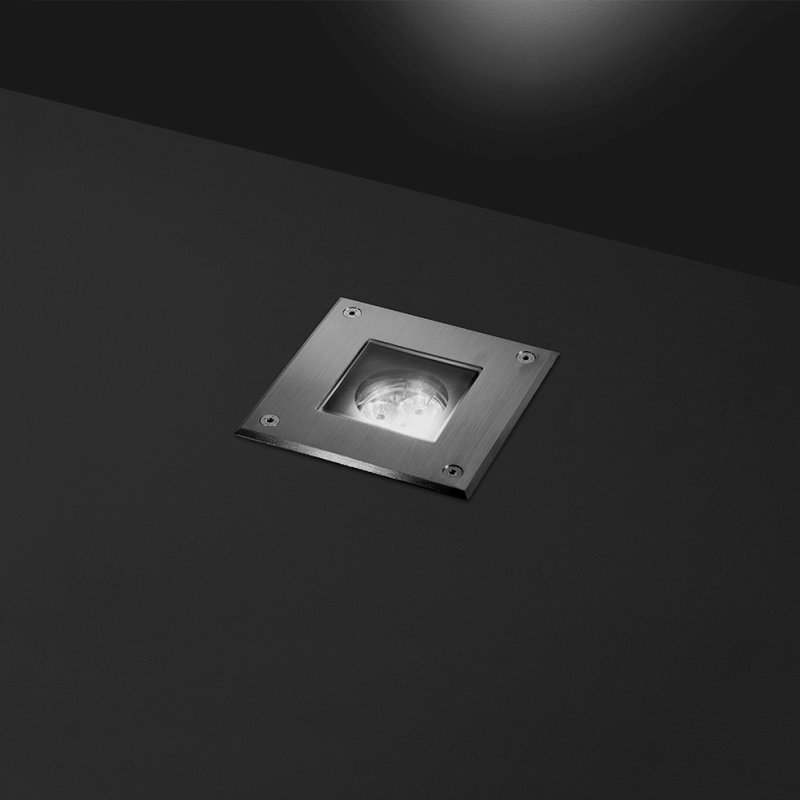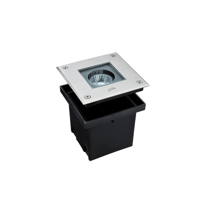 Τετράγωνο χωνευτό στεγανό φωτιστικό εξωτερικού χώρου, σώμα από χυτό αλουμίνιο με φωσφοχρωμίωση και πολυεστέρα με βαφή πούδρας και πλαίσιο AISI 304 από ανοξείδωτο χάλυβα. Σκληρυμένο γυαλί ασφαλείας, χυτή φλάντζα σιλικόνης. GU10 LED / halogen. Βαθμός προστασίας IP67.