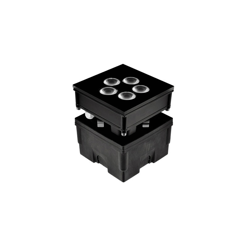 Τετράγωνο χωνευτό στεγανό φωτιστικό εξωτερικού χώρου, σώμα αλουμινίου με επίστρωση φωσφοχρωμάτων και πολυεστέρα. Σκληρυμένο γυαλί ασφαλείας, χυτή φλάντζα σιλικόνης. Ενσωματωμένο driver LED 220-240V 50-60Hz, με 5 CREE XP-G2 LED. Βαθμός προστασίας IP67.
