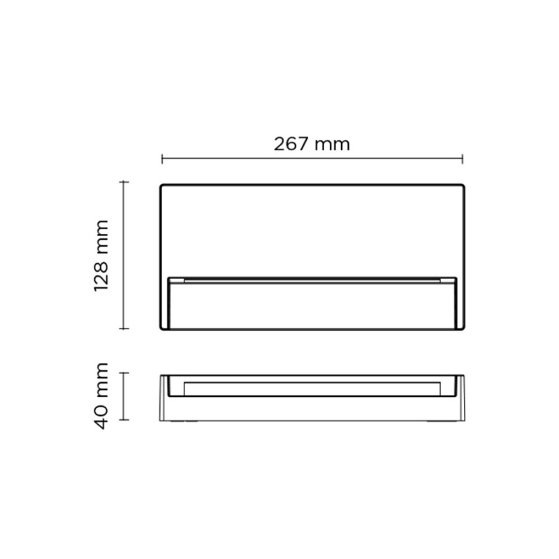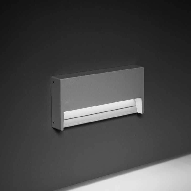 Φωτιστικό τοίχου ορθογώνιο εξωτερικού χώρου, χωρίς να απαιτείται εσοχή. Φωσφοροχρωματισμένο και πολυεστερικά βαμμένο, σώμα από χυτό αλουμίνιο, γυαλί ασφαλείας με σκλήρυνση, χυτό παρέμβυσμα σιλικόνης και βίδες από ανοξείδωτο χάλυβα. Ενσωματωμένος LED driver 220-240V 50-60Hz, με 21 LED μεσαίας ισχύος CREE XH-G. Βαθμός προστασίας IP65.