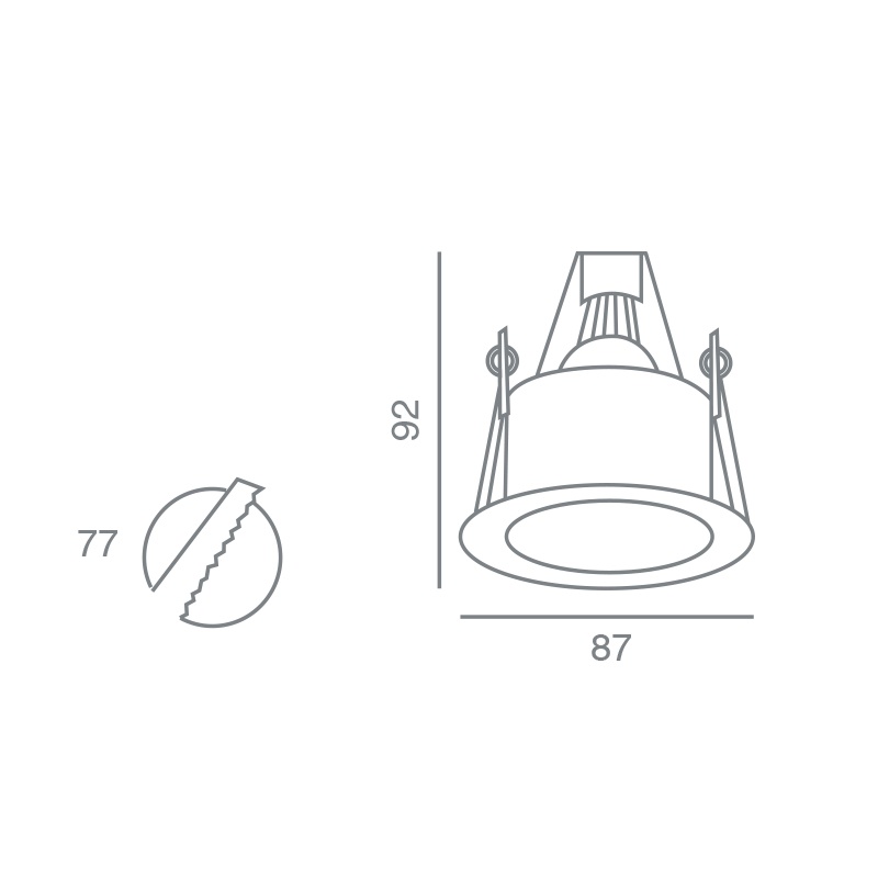 Διαστάσεις Ø 87 mm. H: 92 mm. Κοπή οπής: 77 mm.