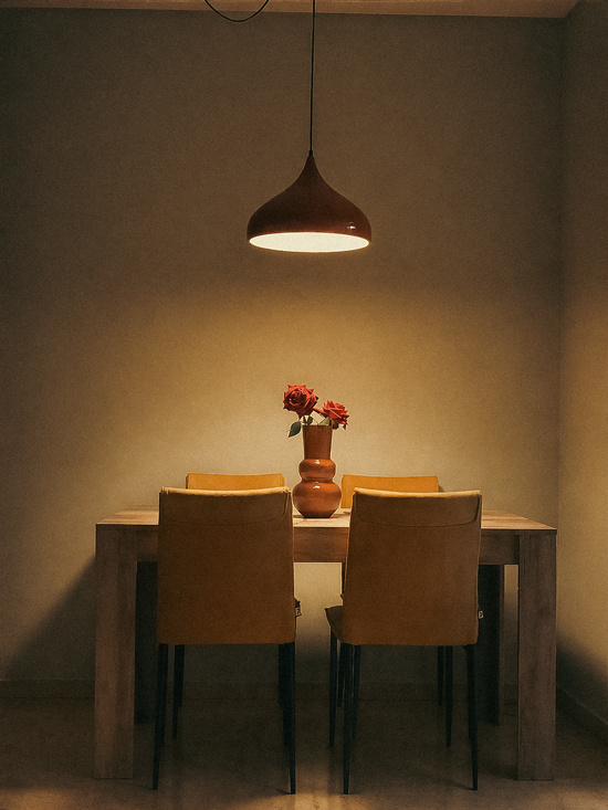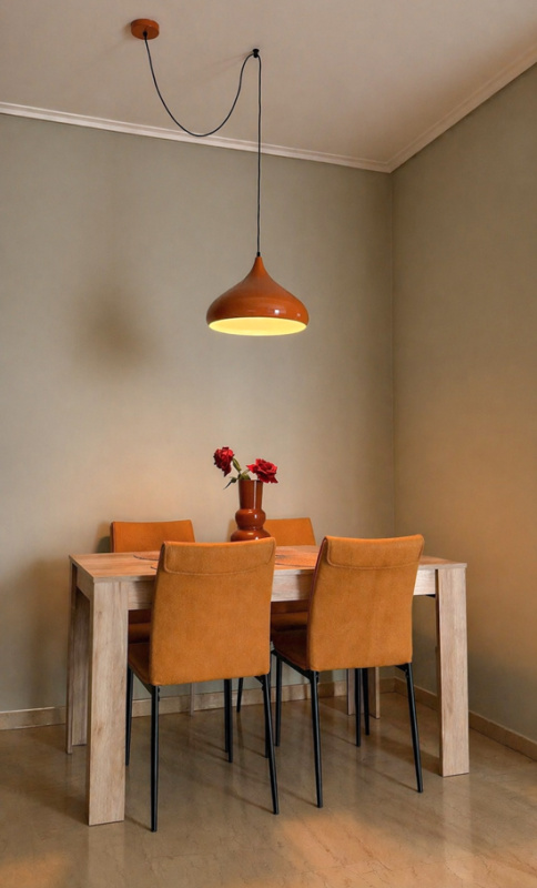 Το κρεμαστό φωτιστικό σε απόχρωση terracotta αποτελεί το ιδανικό στοιχείο για να δημιουργήσετε μια ατμόσφαιρα ζεστασιάς και κομψότητας. Το απαλό, διάχυτο φως του αναδεικνύει τον χώρο, προσθέτοντας βάθος και χαρακτήρα, ενώ ταυτόχρονα δημιουργεί ένα φιλόξενο περιβάλλον για κάθε στιγμή γύρω από το τραπέζι.